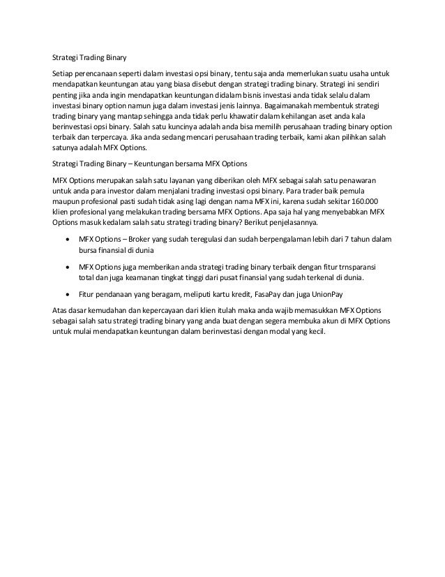 Nama saya wayan dan saya akan berbagi metode trading binary option yang akan membantu anda. Tren investasi di indonesia bergerak menuju arah trading yang mudah namun bisa menghasilkan keuntungan dalam waktu singkat sehingga opsi binary menjadi salah satu pilihan tepat untuk berinvestasi. Binary options, apa itu dan potensi bahayanya ?