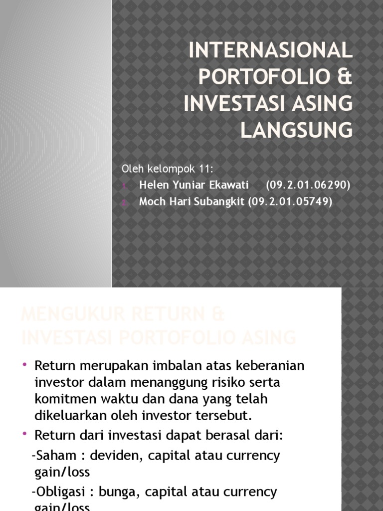 Investasi portofolio asing. Investasi asing langsung sebagian besar dilakukan oleh korporasi dan jarang dilakukan oleh individual. Langsung atau investasi portofolio asing. Jika pembelian saham kurang dari 10% maka international monetary fund (imf) mendefinisikan kepemilikan saham tersebut sebagai portofolio saham seseorang atau suatu perusahaan saja.